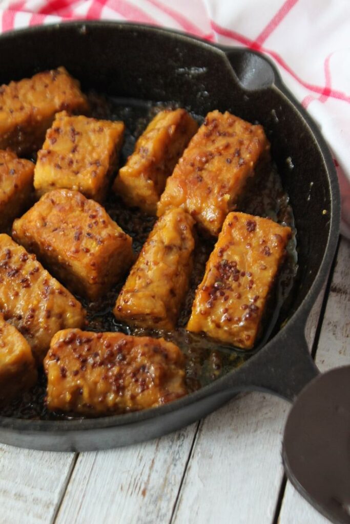 Ingredientes: β 250g de tempehβ 2 colheres de sopa de amido de milhoβ 2 colheres de sopa de azeite de